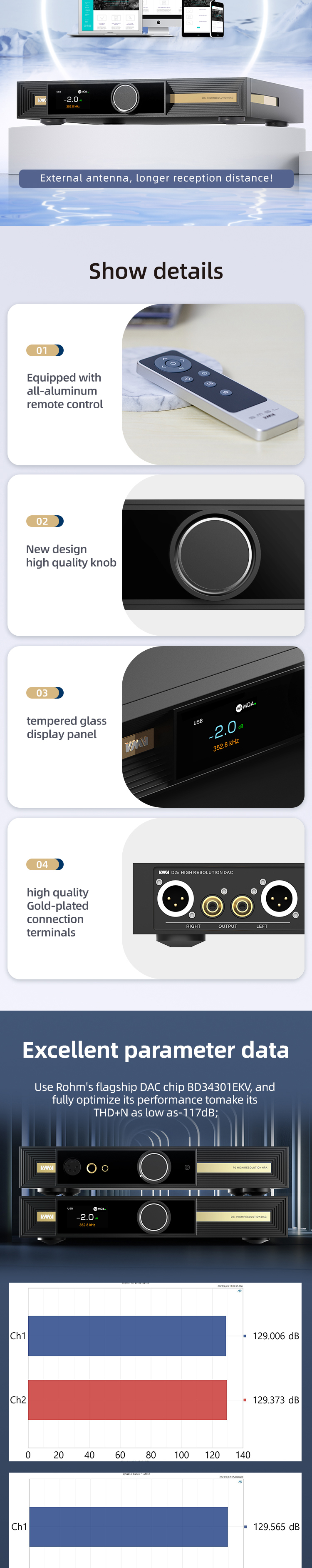 Use Rohm's flagship DAC chip BD34301EKV, and fully optimize its performance to make its THD+N as low as-117dB;