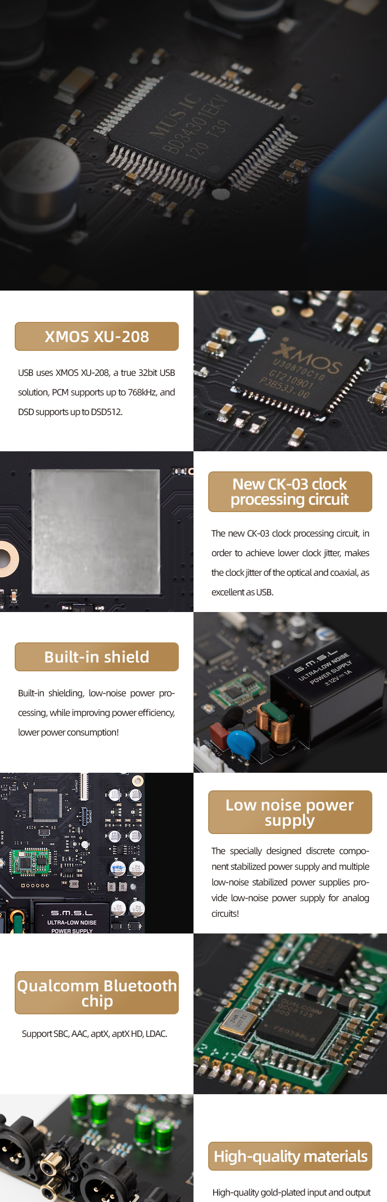 USB uses XMOS XU-208, a real 32bit USB solution, PCM supports up to 768kHz, and DSD supports up to DSD512;