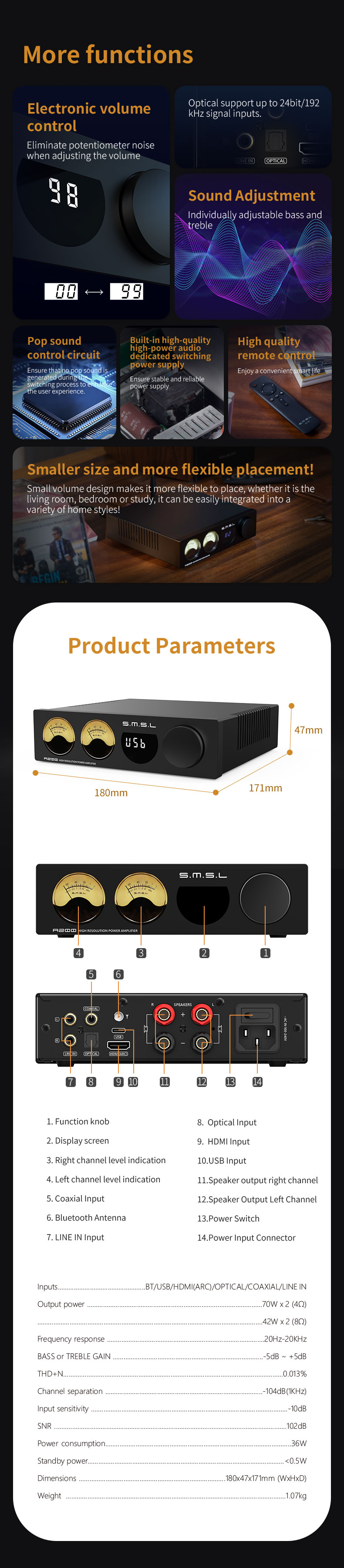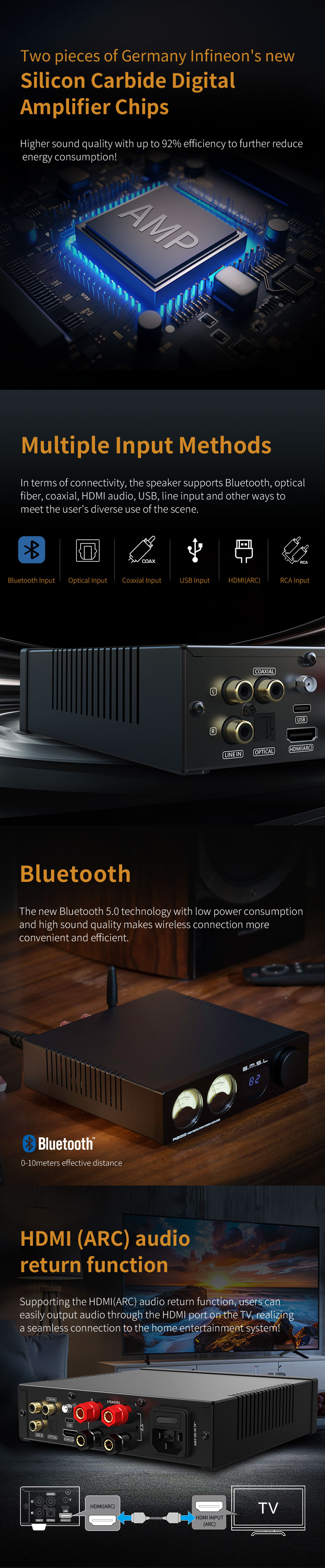 Using 2 pieces of Infineon's new silicon carbide digital power amplifier chips. The power amplifier is designed to provide higher quality and efficiency up to 92%, which further reduces energy consumption;