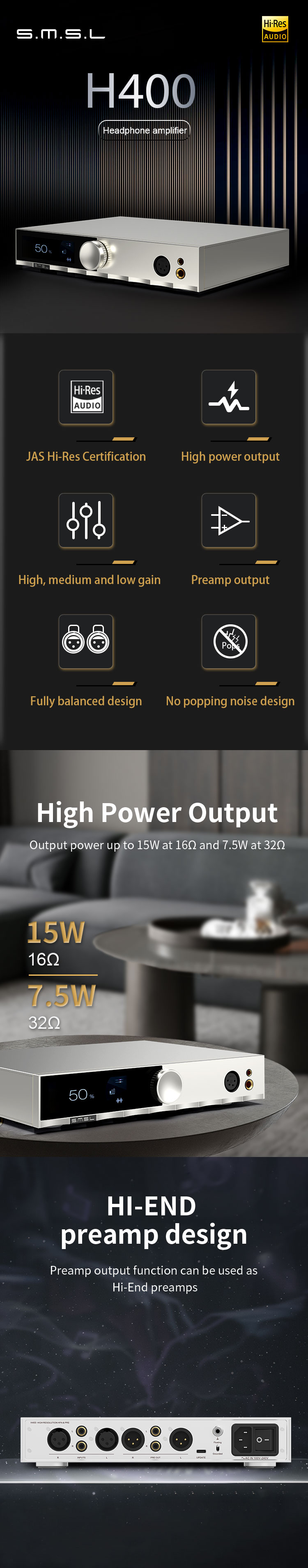 High output power, 16 ohm output power up to 15W, 32 ohms up to 7.5W;