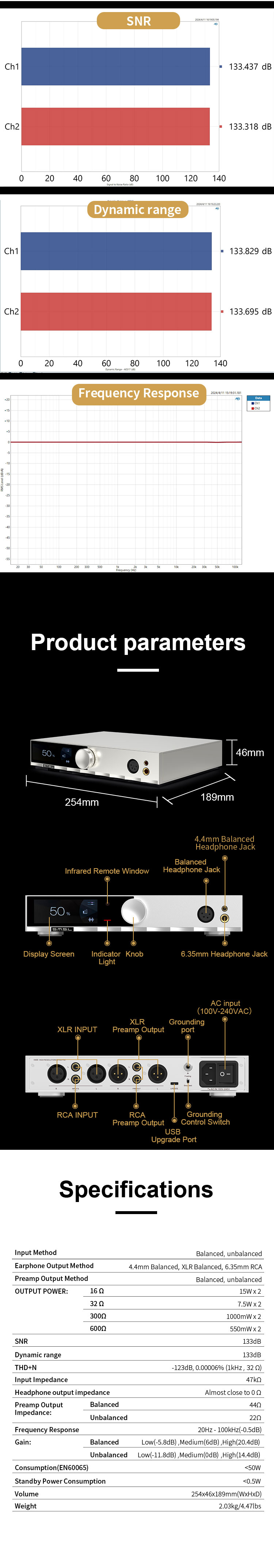 The distortion is as low as 0.00006%, and the SNR is as low as 133dB!