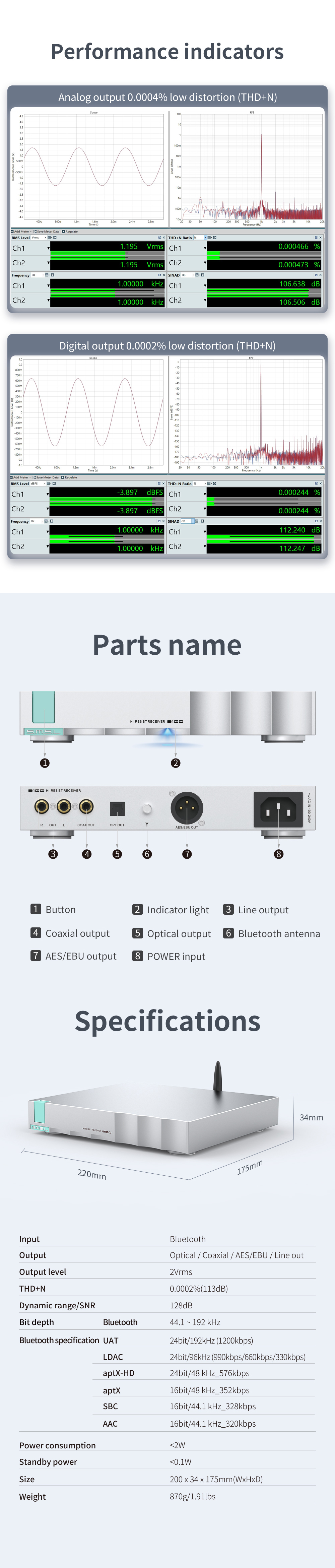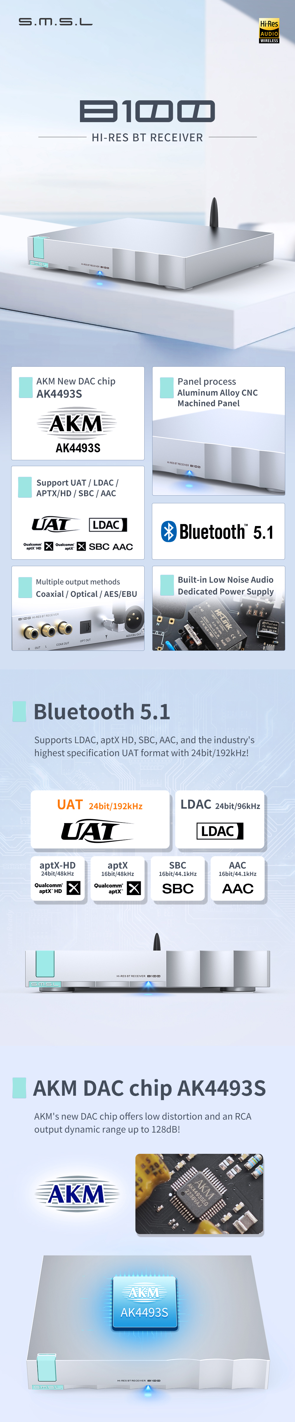 The latest Bluetooth supports LDAC, APTX / HD, SBC, AAC and the industry's highest specification 24bit/192kHz UAT format!